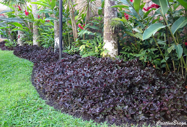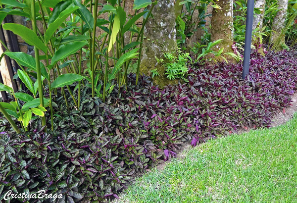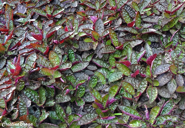 Hera Crespa – Hemigraphis alternata é uma herbácea, pertence à família Acanthaceae, nativa da Ásia tropical, perene, reptante, de 15-20 cm de altura e folhagem ornamental.