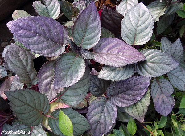 Folhas brilhantes, roxo-prateadas e ornamentais com variedade em folhas lisas e de folhas crespas.