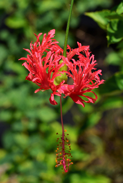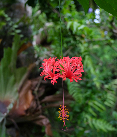 O Hibisco crespo – Hibiscus schizopetalus é um arbusto escandente, pertence à família Malvaceae, nativo da África oriental, perene, ereto, de crescimento rápido, de 3-4 metros de altura com a mesma largura.