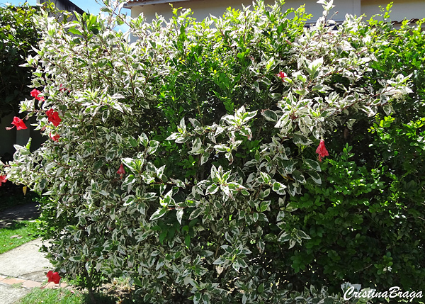 Hibisco – Hibiscus rosa sinensis é um arbusto lenhoso, pertence à família Malvaceae, nativo da Ásia Tropical, perene, de crescimento rápido, de 3-5 metros de altura e muito ornamental.