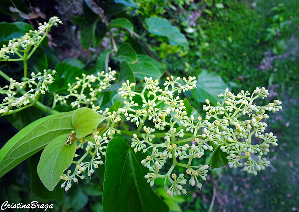 Flores verde ou verde-amarelas, em grupos que se assemelham a cachos. Surgem quase o ano todo e produzem grande quantidade de pólen e néctar atraindo diversas espécies de abelhas.