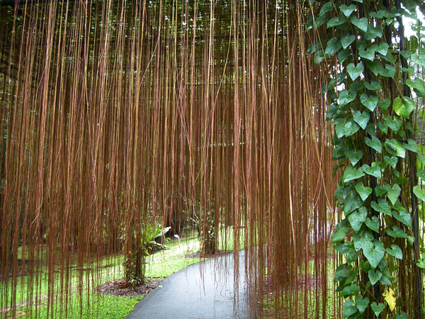 Essa espécie é facilmente identificada pelas raízes adventícias que saem do cipó e que parecem linhas descendo ao chão.