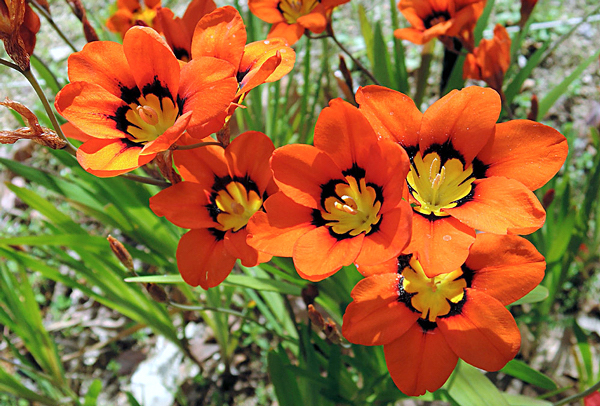 Sparaxis – Gênero de plantas bulbosas, acaules, de até 30 cm de altura. As folhas são em forma de espada, que morrem logo após o florescimento. As inflorescências são coloridas em forma de estrela, apresentam flores em tons de vermelho, laranja, amarelo, lavanda ou branca, adornada com a garganta amarela brilhante e delineada em preto. Florescem no final da primavera ou início do verão.
