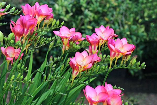 Freesia – Gênero de plantas bulbosas, acaules, de até 30 cm de altura. As folhas são finas e lineares. As flores são alinhadas em pedúnculo recurvado. As espécies apresentam muitas cores, geralmente fortes, que vão desde um azul puro ao branco e exalam perfume agradável. Essas Iridáceas florescem normalmente no final do inverno e prossegue na primavera.