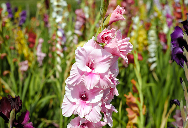 Gladiolus – Gênero de plantas bulbosas, acaules, de comportamento anual, atingem em média 1,50 metro de altura. As folhas são lineares, partindo da base da planta. As inflorescências são de longa duração em forma de espiga e formadas acima da folhagem, nas mais diversas cores e formas. Florescem no início do verão até meados do outono.