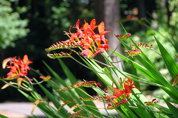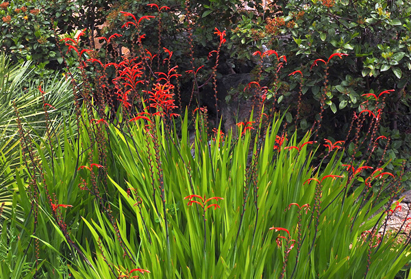 Croscomia – Pequeno gênero de plantas que crescem a partir de cormos subterrâneos, acaules, com cerca de 90 cm de altura. As folhas são lanceoladas, longas com margens inteiras. As inflorescências são terminais em forma de racemo, as flores são sésseis em um pico arqueado, em cores vermelhas e laranjas. Essas Iridáceas florescem desde o início do verão até o outono.