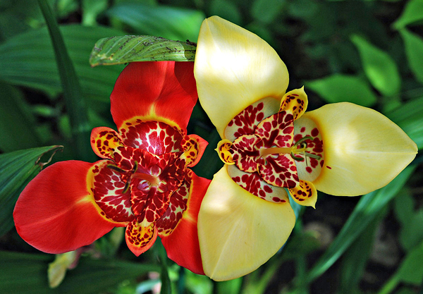 Tigridia – Gênero de plantas bulbosas, acaules, de até 60 cm de altura. As folhas são largas de estrutura dobrada. As flores são grandes, de 10-15 cm de diâmetro, com pétalas em forma triangular, coloridas, exibindo cores variadas e duram apenas um dia. Florescem no verão.