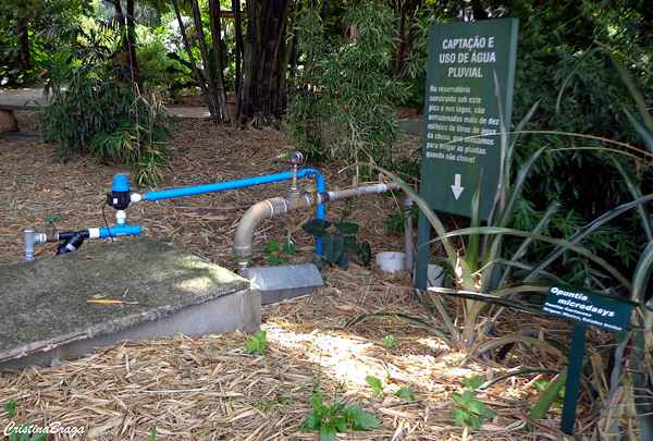 Toda a água do jardim é captada da chuva para um depósito subterrâneo que armazena 14 milhões de litros água, o investimento foi calculado de acordo com a necessidade de manutenção do lago e das espécies de planta.