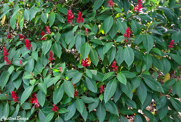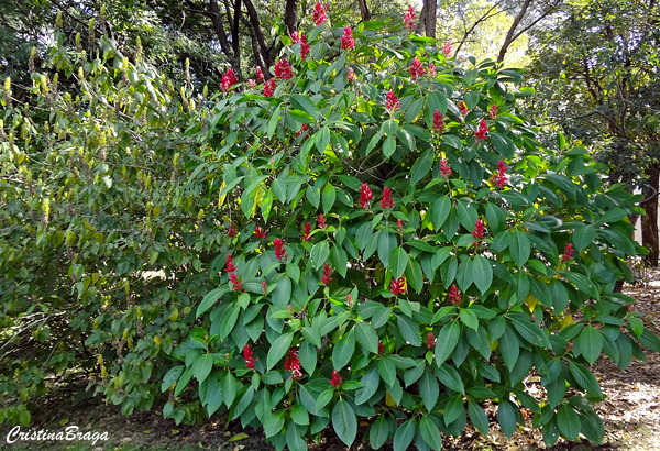 Inflorescências grandes, terminais, em panículas de espigas vistosas de até 30 m de altura. Formadas por brácteas de cor vermelho-escura que envolvem flores bilabiadas, brancas e ricas em néctar. As flores são muito visitadas por beija flores. Surgem na primavera-verão, duráveis e atraem beija-flores.