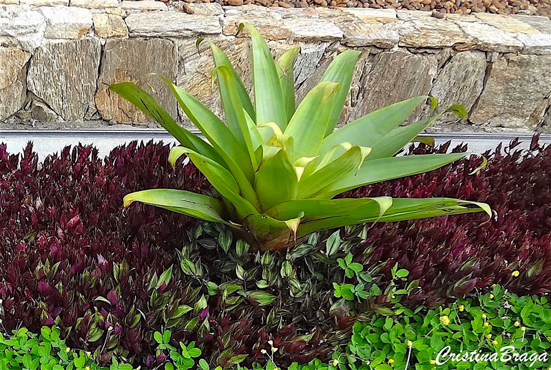 Quando protegidas do sol, na sombra da bromélia, as folhas se apresentam verdes e abertas.