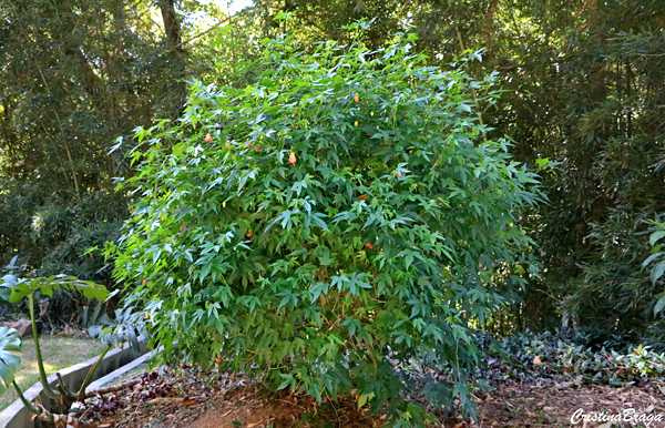Folhas simples, com vários recortes profundos, longo pecioladas, membranáceas, glabras, de 6-14 cm de comprimento. Ocorre uma variedade variegata.