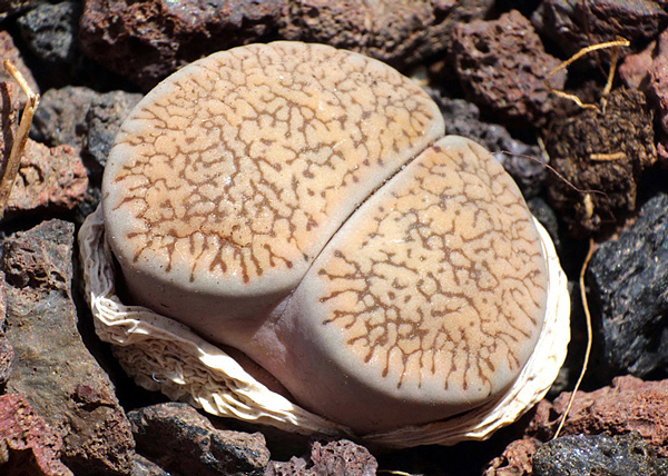 Lithops são plantas de mimetismo anãs e suculentas que compreendem duas folhas semi-translúcidas carnudas que se assemelham a pedras.