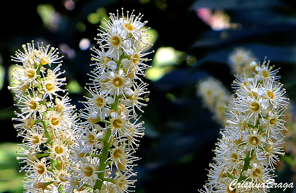 Inflorescências de 10-15 cm de comprimento, com flores agrupadas em linhas axilares com 30-40 flores. As flores são brancas, pequenas e “muito perfumadas”. Surgem na primavera e atraem abelhas e borboletas.