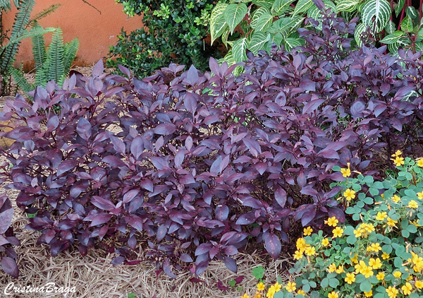 Folhas elípticas e decorrente sobre o pecíolo, membranácea, de margens inteiras, com nervação discreta e de coloração roxo-escura.