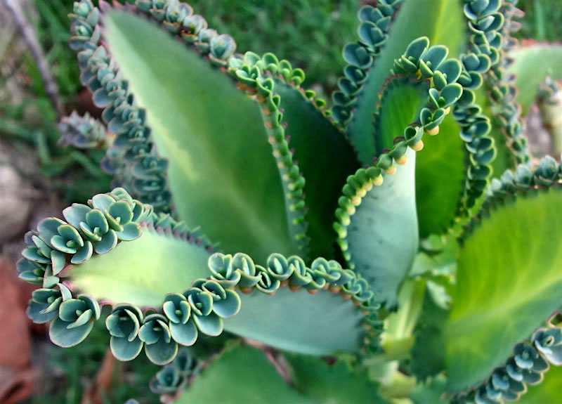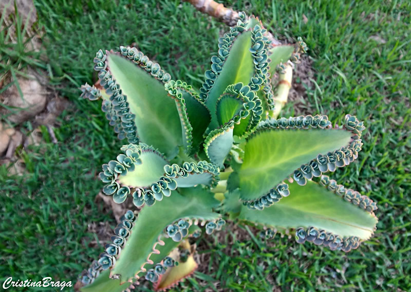 Folhas grandes, grossas, carnudas, oblonga a elíptica, dobrada longitudinalmente como uma calha, verde azuladas, de até 20 cm de comprimento e de até 8 cm de largura. Nas bordas das folhas é produzida uma grande quantidade de mudas.