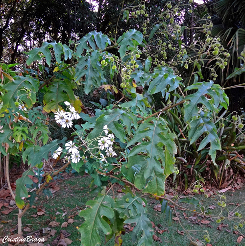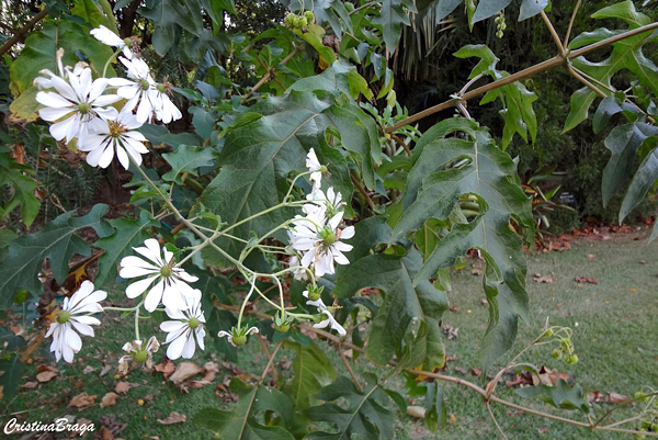 Folhas opostas, grandes, pubescentes, de cor verde-acinzentada, profundamente lobadas em 8-10 lobos acuminados, de margens serrilhadas e longos pecíolos usualmente alados.