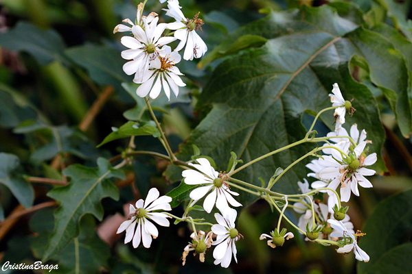 Inflorescências do tipo panícula, muito ramificadas e compostas por numerosos capítulos. Cada capítulo, que tem o aspecto de uma flor, é uma inflorescência, com flores sésseis em um receptáculo cônico no centro e flores liguladas na periferia, com pétalas brancas e com perfume que lembra a baunilha. Surgem no outono e atraem abelhas, borboletas e pássaros.