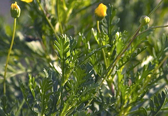Folhas compostas pinadas, de folíolos finos e de formato irregulares de cor verde amarelada que que emite uma forte fragrância quando esmagada.
