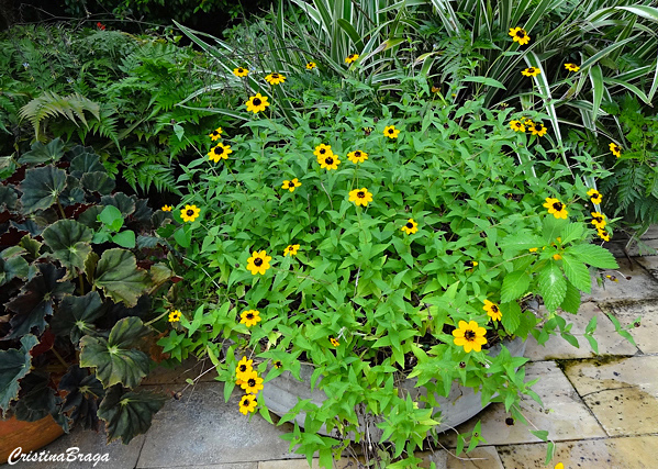 Inflorescências terminais, em capítulos numerosos, solitários, amarelos com o centro preto e de pedúnculo curto mas dispondo acima da folhagem. Surgem quase o ano todo e atraem abelhas.