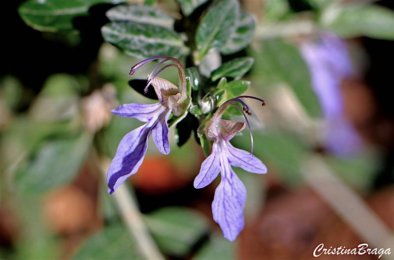 Flores pequenas, solitárias, axilares, de cor azul malva. Surgem no verão e atraem abelhas.