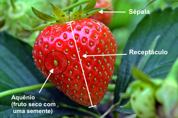 Botanicamente, o morango é considerado um “fruta acessória ”e não é uma verdadeira baga. A polpa consiste em um receptáculo de flores muito grande e é incrustado com os muitos frutos verdadeiros, ou aquênios, que são popularmente chamados de sementes.