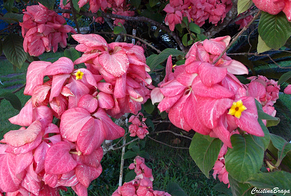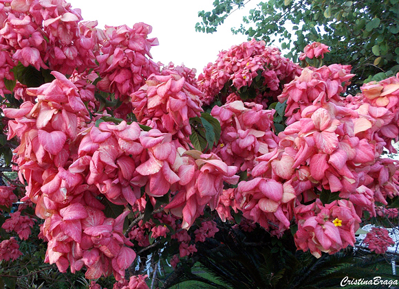 A Mussaenda rosa é um arbusto, pertence à família Rubiáceas, perene, semi-lenhoso, ramificado, de 2-3 metros de altura.