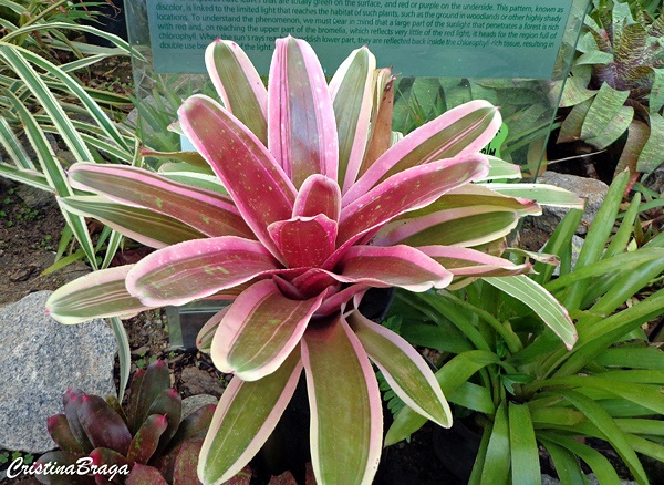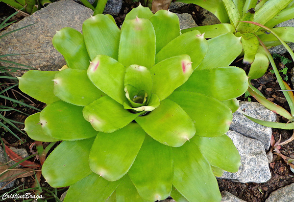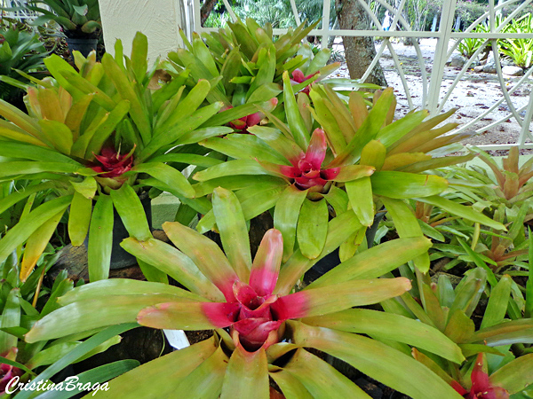 Durante o período de floração as folhas assumem uma tonalidade avermelhada próximo ao copo central e assim permanece por vários meses.