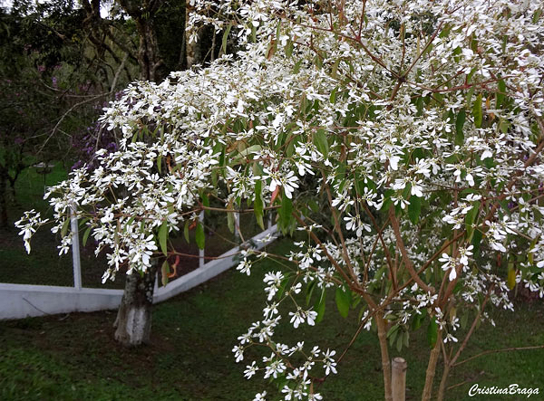 Caule marrom-claro, muito ramificado, apresentando copa globosa e muito florífera.