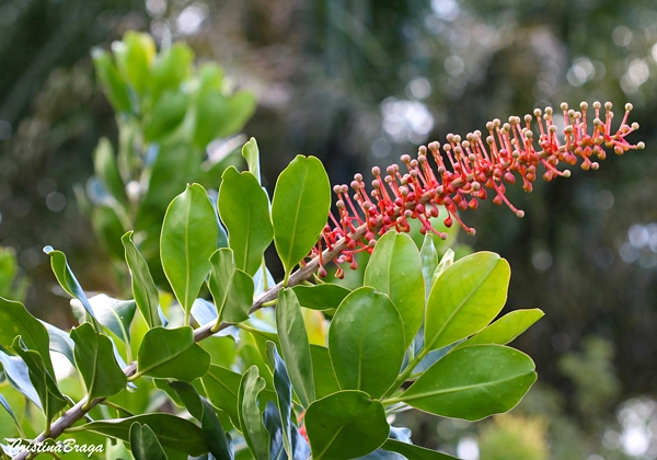 Folhas coriáceas, marcadas pela nervação impressa na face superior.