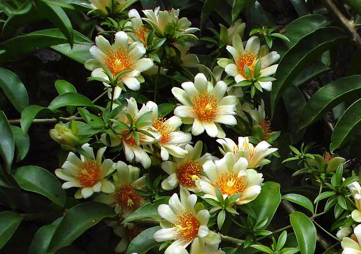 Flores brancas e perfumadas com miolo alaranjado. Cada florada tem duração entre dois e três dias, com floração intensa, durante 6 meses. Surgem na primavera-verão e atraem abelhas.