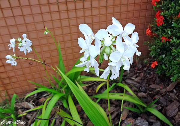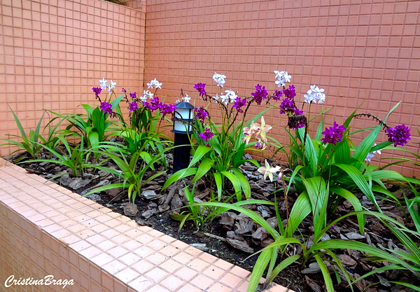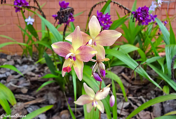 Orquídea Spathoglottis plicata, pertence à família Orchidaceae, nativa Tailândia, Vietna, Borneo, perene, terrestre, com porte de até 40 cm de altura com pendões florais que alcançam 80 centímetros.