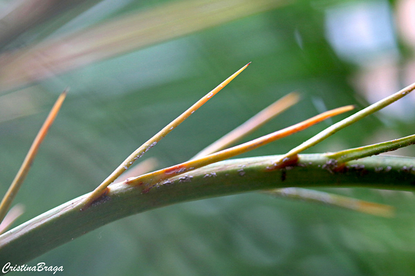 Folhas compostas, pinadas de coloração verde escura brilhante, com cerca de 1,50 de comprimento, flexíveis, dando um aspecto delicado à planta, próximo ao caule têm espinhos grandes.