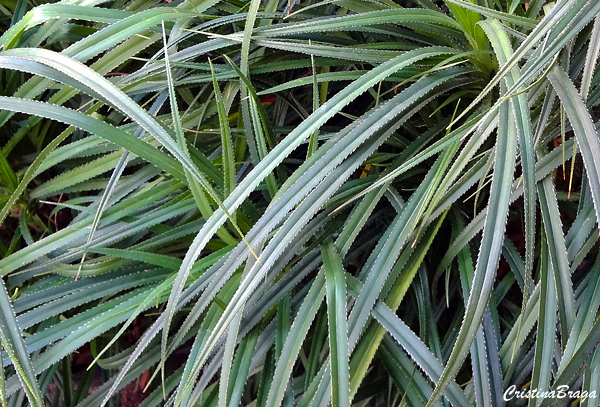 Folhas em roseta, concentradas na extremidade dos ramos, lineares, recurvadas, verde-escuras, brilhantes e com espinhos pequenos nas margens.