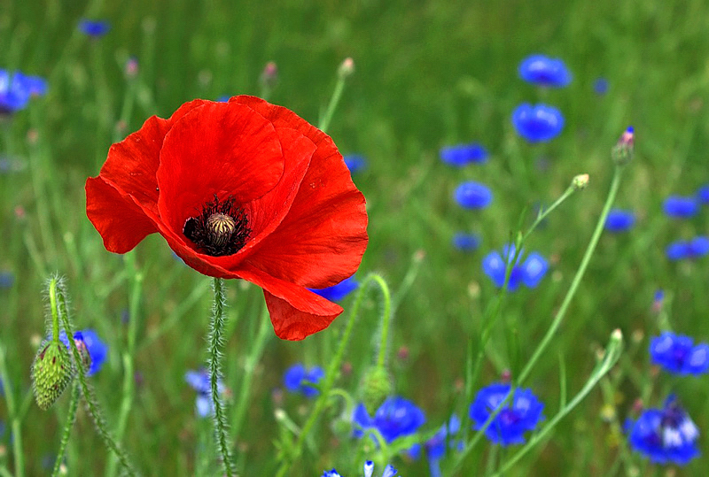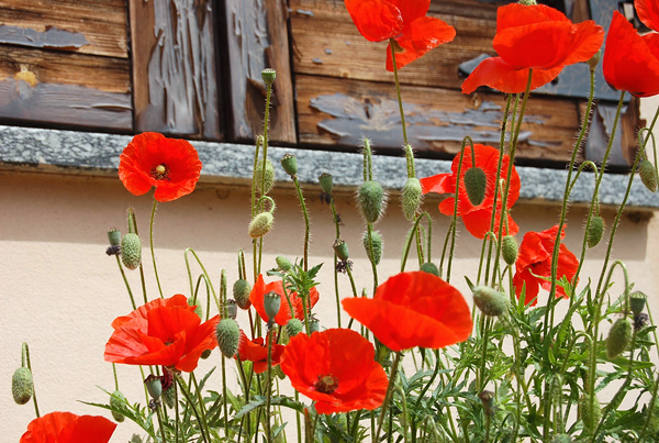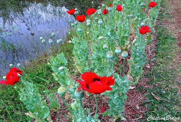 Flores solitárias, dispostas bem acima da folhagem, com 4-6 pétalas muito finas, brilhantes, de coloração vermelha com mancha preta ou violácea na base, às vezes alaranjadas ou rosa-claro. Surgem durante a primavera e atraem abelhas.
