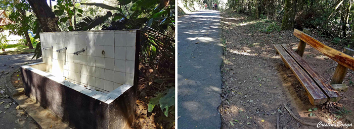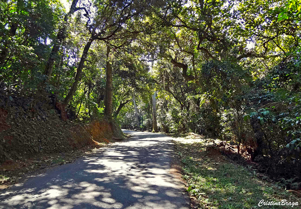 A caminhada até o ponto mais alto da Serra da Cantareira é feita numa rua de asfalto e na maior parte do tempo sob a sombra peneirada das árvores..