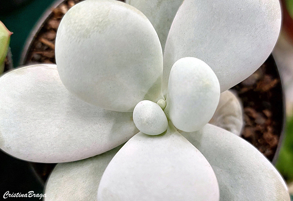 A Pedra da Lua – Pachyphytum oviferum é uma suculenta, pertence à família Crassulaceae, nativa do México, perene, de crescimento lento, de até 20 cm de altura com rosetas de 6-10 cm de diâmetro.