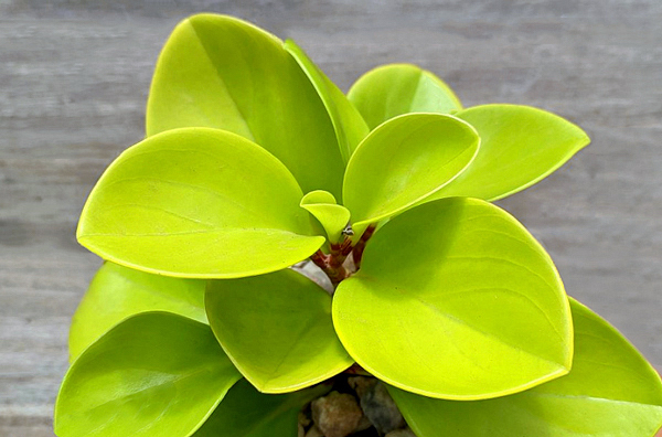 Folhas largamente obovadas, cerosas, carnosas, lisas, de 6-9 cm de comprimento. Ocorrem diversas variedades, com folhas de diferentes cores: verde escura na forma típica, amarelo na limão, variegação branca, creme ou cinza na variegada.