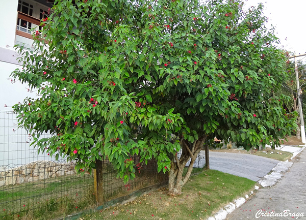 Inflorescências corimbosas longo-pedunculadas, expostas na altura da folhagem. Flores vermelho escuras, pequenas, de cerca de 2,5 cm de diâmetro. Surgem na primavera-verão e atraem borboletas e beija flores.