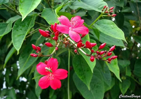 A Peregrina – Jatropha integerrima é um arbusto ou arvoreta, pertence à família Euphorbiaceae, nativo das Antilhas, perene, de crescimento moderado, de até 3 metros de altura e muito ornamental.