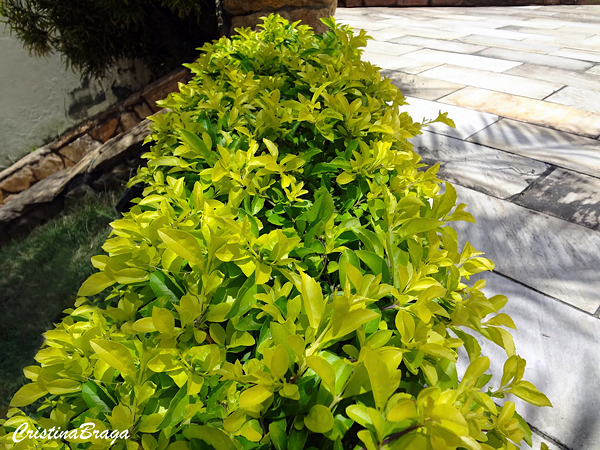 Folhas de cor amarelo-dourado, principalmente nas folhas jovens, cartáceas, glabras, de margens lisas, de 3,5 cm de comprimento.