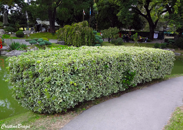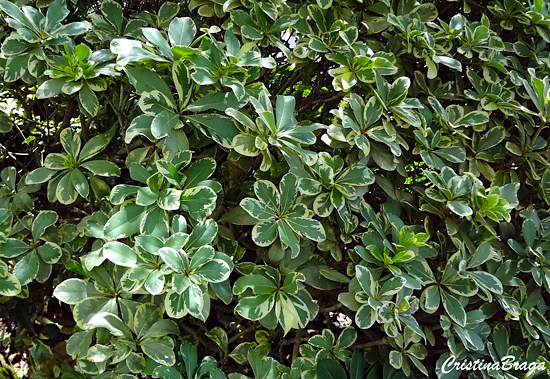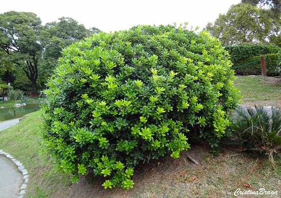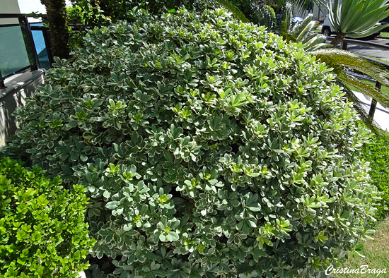 O Pitosporo Japonês – Pittosporum tobira é um arbusto, pertence à família Pittosporacea, nativo da China e Japão, perene, lenhoso, de crescimento lento, aromático, ramificado, de 2-3 m de altura, de folhagem ornamental.