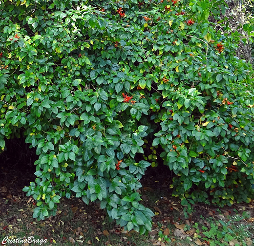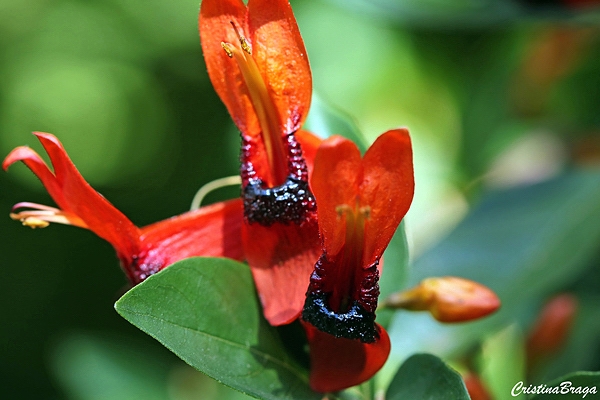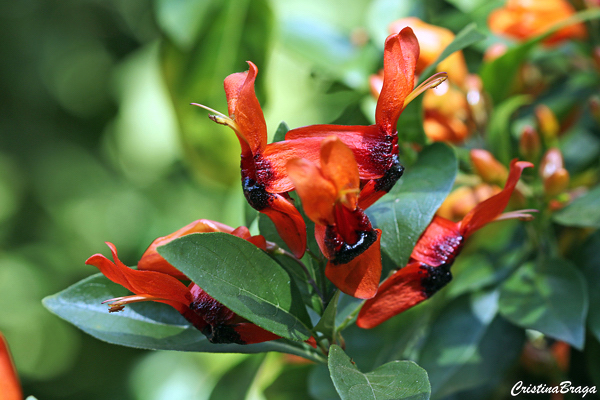 Flores terminais ou laterais, solitárias ou em grupos de 3-5, com duas pétalas de cor vermelho-alaranjada, sendo a superior bilobada, a inferior retroflexa e trilobada com a boca negra, ricas em néctar, com cerca de 5-7 cm de comprimento. Surgem no outono-inverno e atraem abelhas, borboletas, colibris e beija-flores.