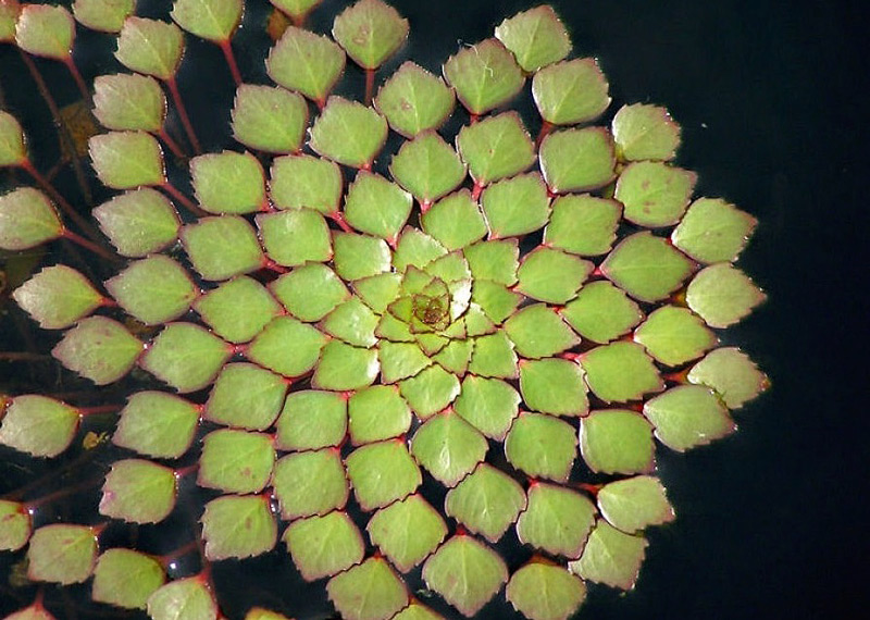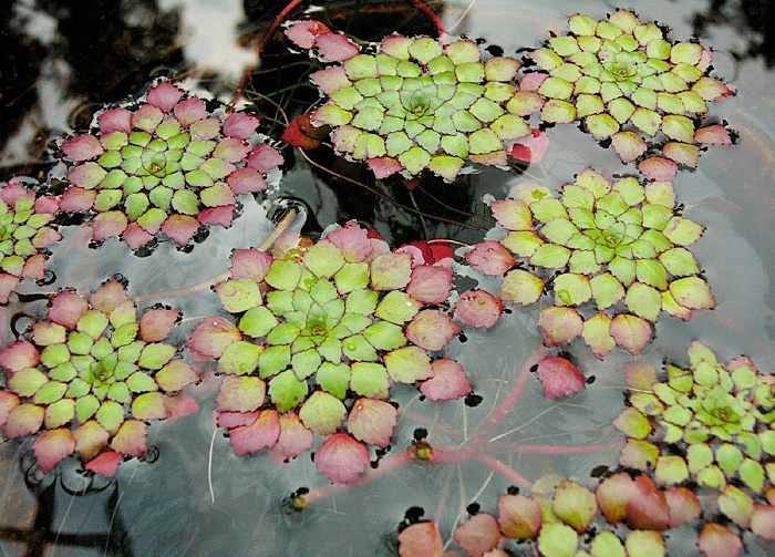 Folhas em formato de diamante, crescem em várias séries helicoidais, podem ser vermelhas ou verdes, mas sempre com o lado inferior avermelhado, se dispõem na forma de rosetas geométricas que variam de 5-20 cm de diâmetro e flutuam graciosamente sobre a superfície da água.