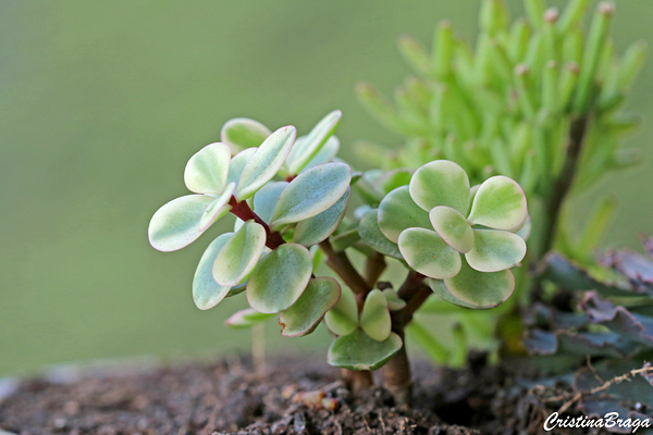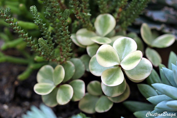 Portulacaria afra Variegata é um arbusto, pertence à família Portulacaceae, nativo da África do Sul, perene, suculento, de crescimento lento, bem ramificado e até 2,5 metros de altura em seu habitat natural.