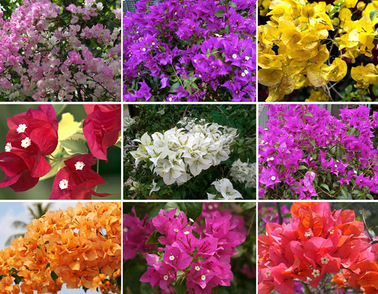 Flores pequenas, envolvidas por 3 brácteas grandes, vistosas, nas cores branca, rosa claro, coral, carmim, laranja, purpura e amarelo. As brácteas formam-se em grandes cachos nas pontas dos ramos, simples ou dobradas. Surgem principalmente na primavera-verão e esporadicamente durante o ano.