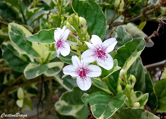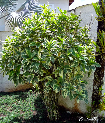 O Pseuderanthemum carruthersii é um arbusto, pertence à família Acanthaceae, nativo da Polinésia e Melanésia, perene, ereto, lenhoso, ramificado, de 1,50-2,00 metros de altura e folhagem ornamental.