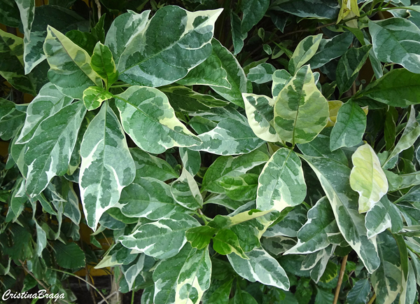 Folhas simples, de lamina cartácea, oblanceolada, glabra em ambas as faces, com manchas irregulares branco-acinzentadas, de margens inteiras ou irregulares e onduladas de 6-14 cm de comprimento, com pecíolo de cerca de 1 cm.