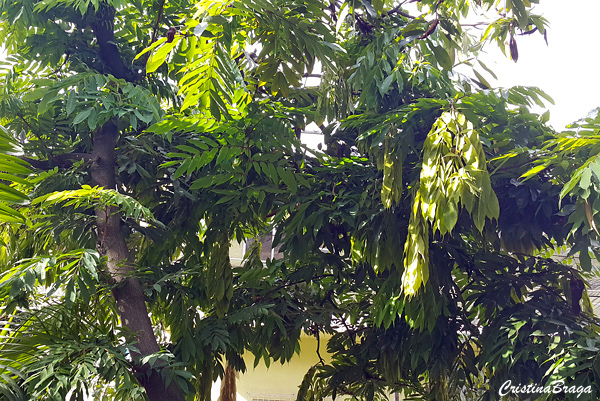 Os frutos que se formam são do tipo legume (vagem), grandes, de cor marrom, densamente cobertas por pelos e contém de uma a duas sementes, marrons e com superfície enrugada.
