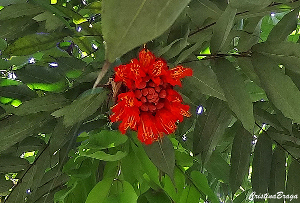 As flores possuem pétalas de cor vermelha ou alaranjada com longos estames, que se abrem da margem em direção ao centro da inflorescência. Surgem quase o ano todo, com maior intensidade na primavera e atraem borboletas, abelhas e especialmente os colibris.