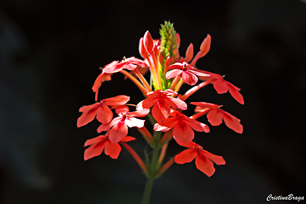 Inflorescência densa e compostas de muitas flores. As flores possuem 5 lóbulos que variam ligeiramente em tamanho. Um dos 5 lóbulos tem uma mancha distinta perto da base da pétala, enquanto os outros 4 lóbulos podem ou não ter marcas semelhantes, mas menores. As flores podem ser nas cores vermelha, rosa salmão, escarlate ou vermelho alaranjado. A ponta da pétala pode ser arredondada ou ligeiramente pontiaguda. Surgem quase o ano todo e atraem borboletas.